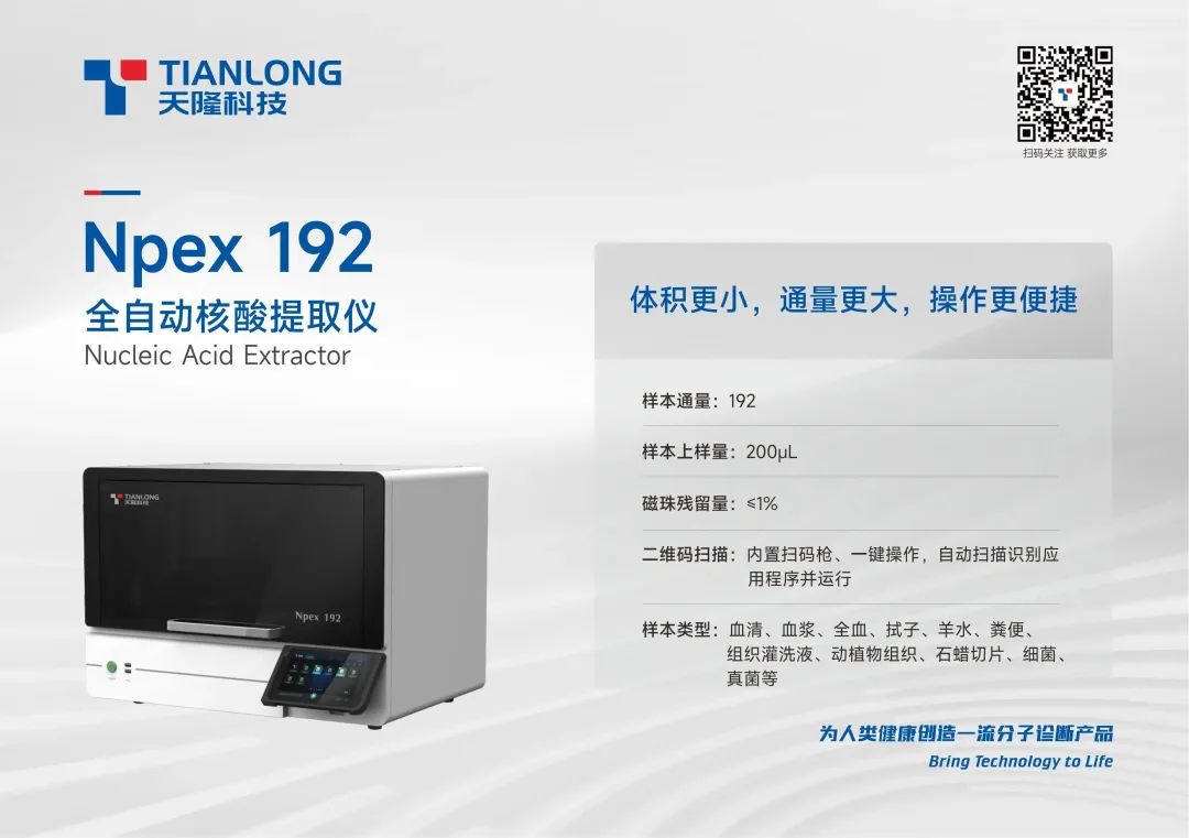 同时,采用天隆最新一代技术的Npex 192全自动核酸提取仪,因为体积更小,通量更大,操作更便捷,备受客户关注。Npex 192采用整板加样提取,内置试剂程序扫码器,只需一键操作,便可运行,极为简便,且12分钟即可完成192份样本的核酸提取!