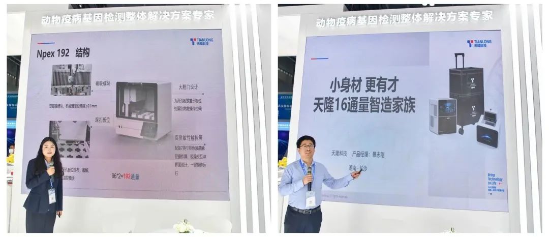展会上,天隆科技携iGenecase 1600便携式核酸检测箱、Npex 192全自动核酸提取仪、GeneFlex 16全自动核酸提取仪、Gentier mini+便携式荧光定量PCR仪等多款新晋明星产品,亮相W325展位。这些匠心新品全方位展示了天隆科技在动物疫病防控领域的多个创新成果,并以“解放双手”、“操作便捷”、“结果精准”的产品特色及优势,吸引到全国各地与会的专家老师们,驻足参观交流。