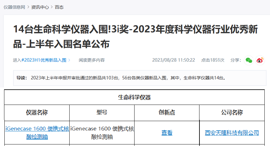 2023-09-07喜讯|iGenecase 1600便携式核酸检测箱入围3i奖2023年优秀新品了解更多